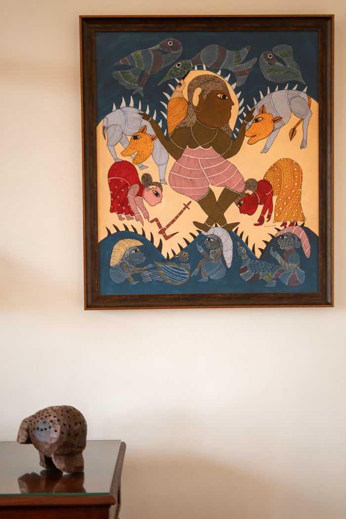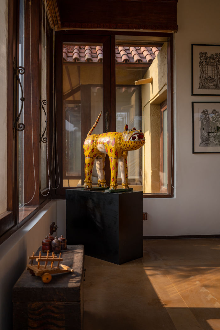 Representing grounding, stability, and life itself, the element of Earth comes alive through the villa’s natural materials. Intricately carved wooden doors, sturdy pillars, and terracotta-inspired sculptures reflect a deep connection to the land. The walls are adorned with Gond paintings that depict flora, fauna, and tribal life, echoing the essence of Earth and its bounty.