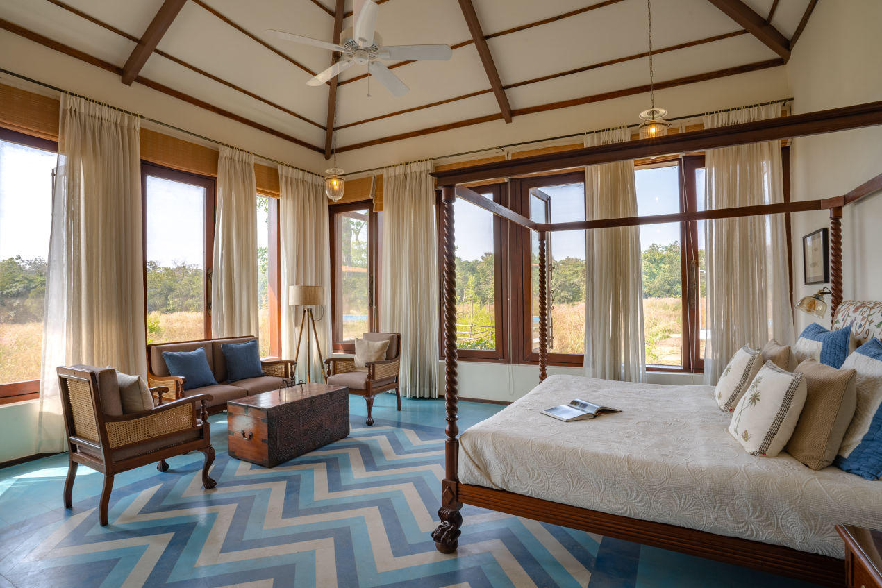 The element of Wind conveys freedom, movement, and breath. The villa’s design embraces open spaces and high ceilings that allow natural airflow to sweep through, creating a sense of lightness and peace. Breezy courtyards and verandas invite you to bask in the cool winds of Pench, while tall windows frame sweeping views of the wilderness.